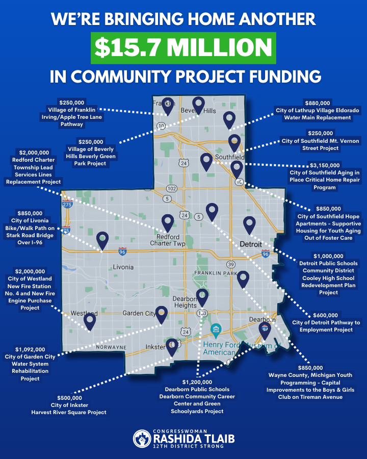 DETROIT — Today, Congresswoman Rashida Tlaib (MI-12) announced that she secured $15,722,000 in Community Project Funding for Michigan’s 12th Congressional District in the fiscal year 2026 appropriations bills.